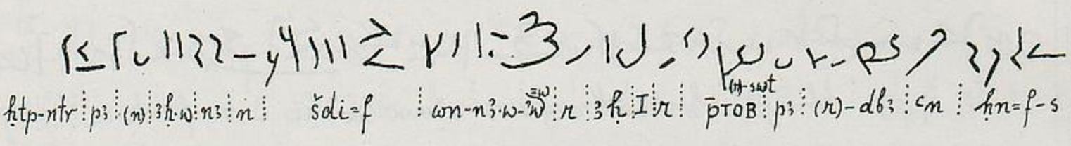 ḥn -f s ꜥn r=č̣bꜣ pꜣ= rtb sw r sčꜣ 1 ꜣḥ r:_ wn=nꜣ:w=jw -w šṭy -f n nꜣ= ꜣḥ:w n pꜣ= ḥtp=nčr
