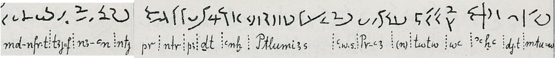 Hieroglyphic, 196 B.C., line no. 6mtw =tw s:ꜥḥꜥ ẖn.tï n(ï) (n)sw-bjt Ptwlmys ꜥnḫ ḏ.t mr.y Ptḥ nṯr pr(j) nb- nfr.(w) kꜣ.tw